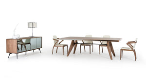 This modern dining table is a unique and interesting addition to your dining space. With the smooth top, messes are easily cleanable and gives a hint of sophistication to your dining room. The small table invites everyone to join in and have an intimate meal together. With the walnut finish, this dining table can easily be dressed up or down.