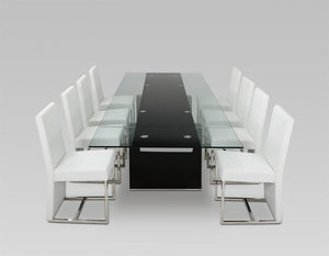 This contemporary dining table adds a chic elegance to any dining area. Crafted with a glass top for easy clean-up, the extendable surface is perfect for accommodating extra guests and family members. Boasting a neutral color scheme, it can be customized to suit any decor.