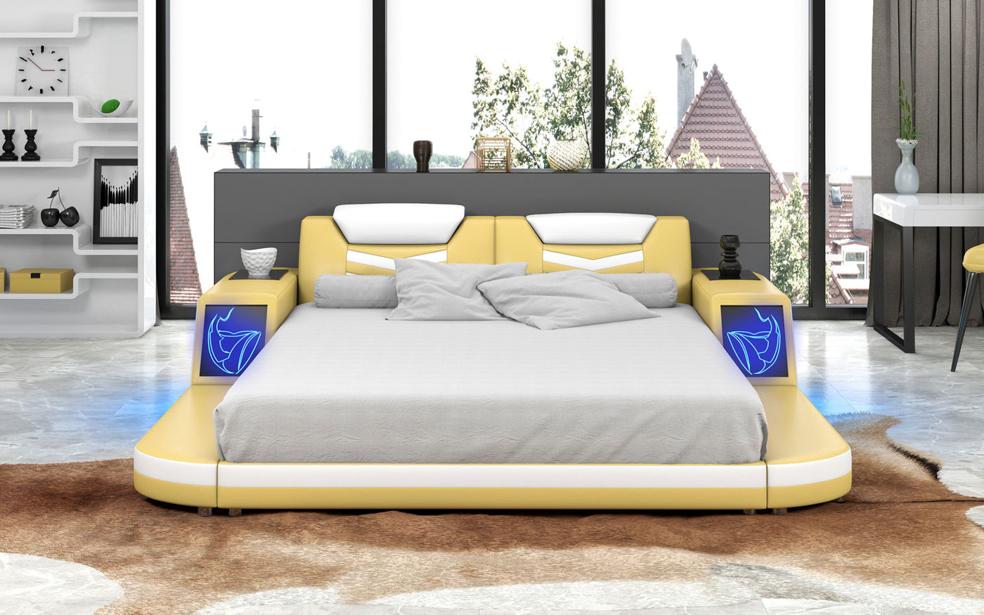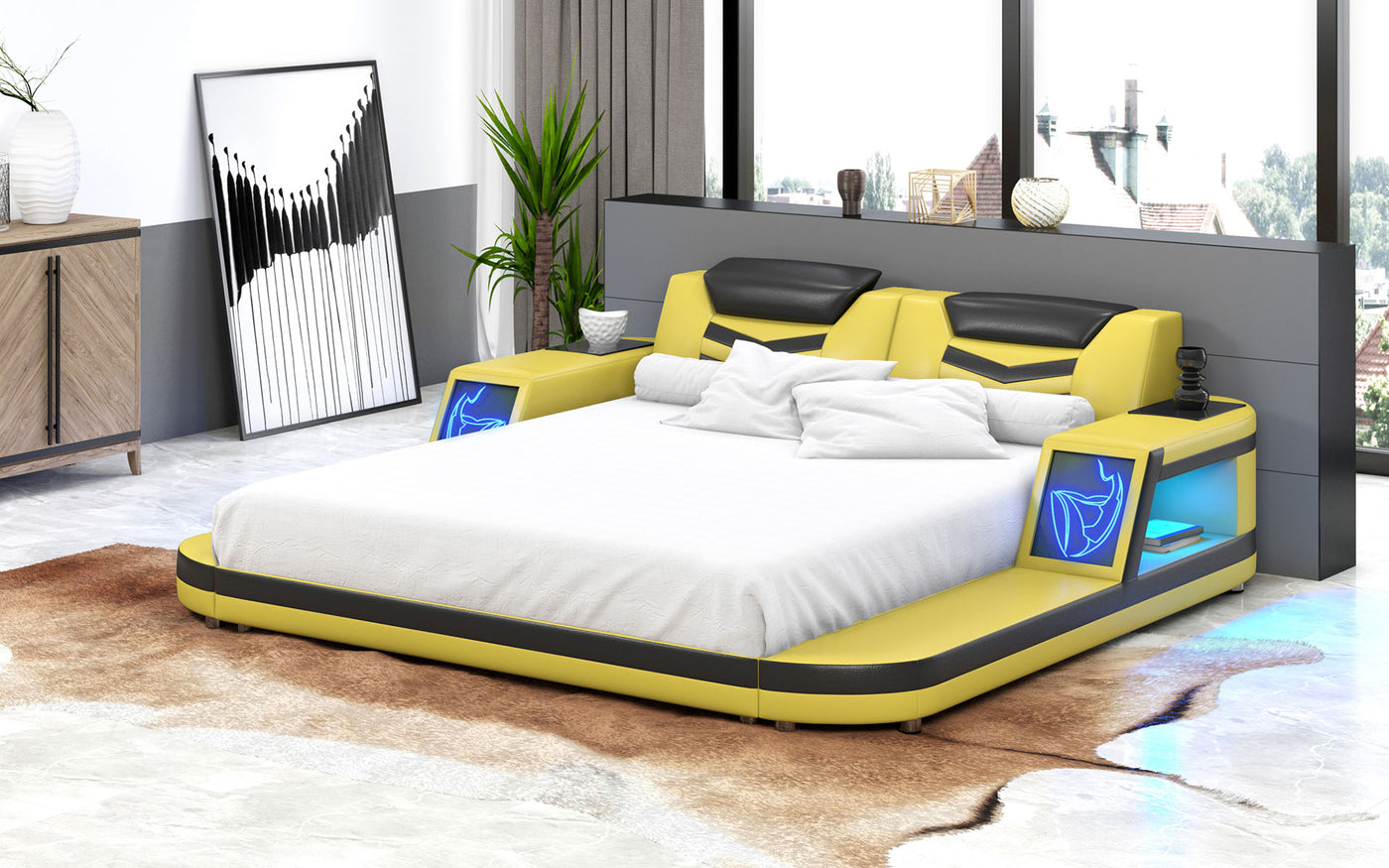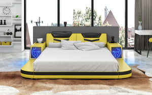 This Maeve Modern Leather Bed with Storage is a smart bed that combines modern furniture with practicality. The bed is crafted from high-quality leather and includes built-in storage compartments that are located on the sides of the bed frame. This modern leather bed is designed to be both stylish and functional, making it the perfect choice for anyone who wants a contemporary bed that doesn't compromise on convenience. The Maeve Modern Leather Bed is available in a range of sizes and styles, making it a versatile addition to any bedroom decor.