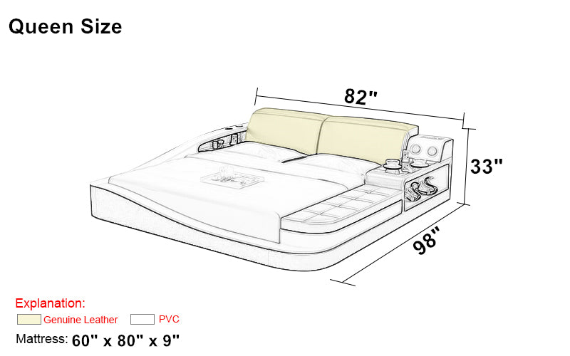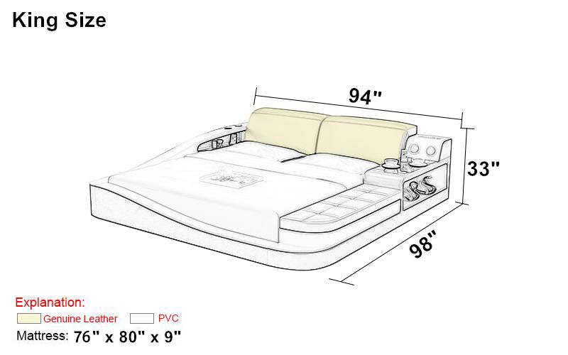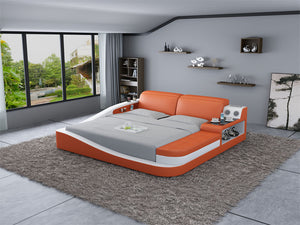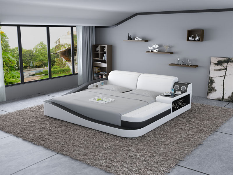 The Rebino Leather Bed with Storage is a modern and functional masterpiece. The bed's sleek leather finish and elegant design make it a stylish addition to any contemporary bedroom, while the customizable options allow you to choose the perfect color to match your decor. The bed also features smart technology, including a Bluetooth speaker and USB port, making it easy to stay connected and entertained from the comfort of your own bed. With its built-in storage, this bed maximizes space in your room, while the comfortable slats provide a restful sleep experience. Upgrade your bedroom with the Rebino Leather Bed with Storage for a luxurious and practical sleeping solution.