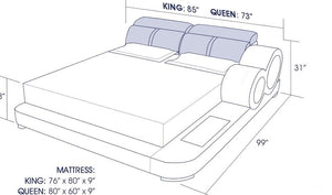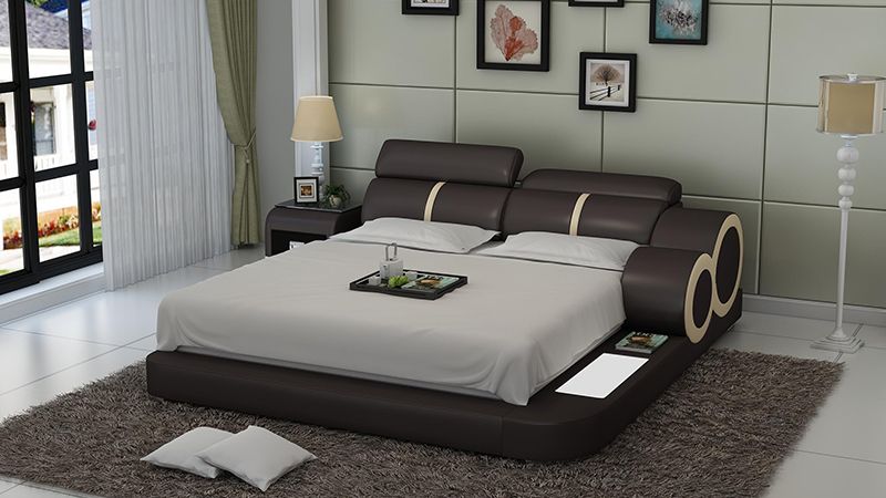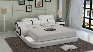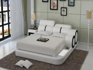 This Soleia Leather Bed with Adjustable Headrest is the most unique bedroom design on the market. With large, dramatic curvy edges and 2-tone color design, this bed will immediately distinguish your room as an ultra-modern haven. The matching night stand includes a storage cabinet along with a subtle opening at the base for books and magazines. Top headrests are adjustable for maximum comfort. The two side lights add a sleek look that will impress guests. The multi-color lights are controlled by a wireless remote. This leather bed is available in Italian leather and bonded leather. Choose your preferred color leather from a selection of 10 distinct colors. The beauty of a minimalist bed is you can dress up your space with decorations or wallpapers without the bed contrasting intensely. Available in queen, king, or Californian king to provide resting space in your sanctuary.