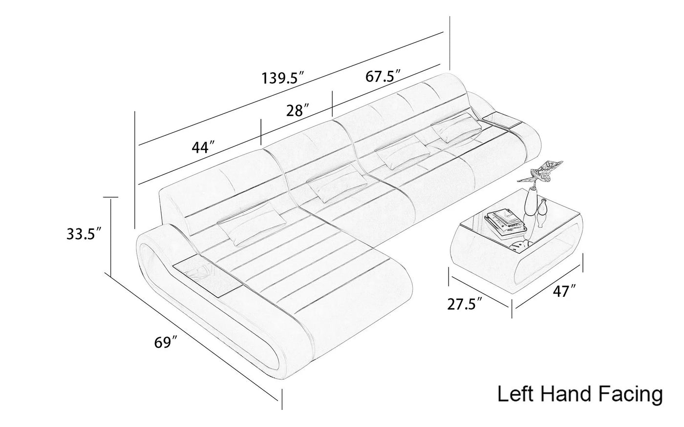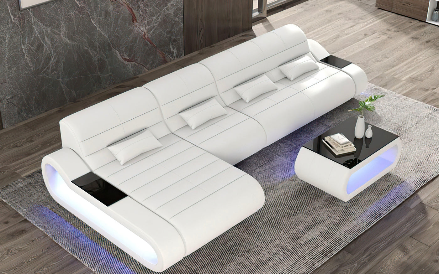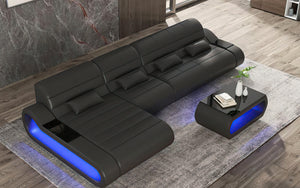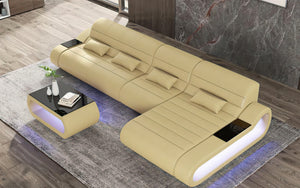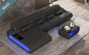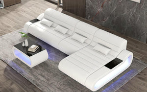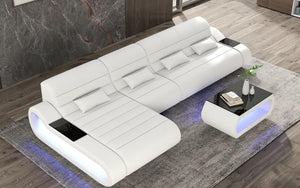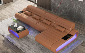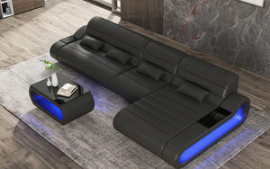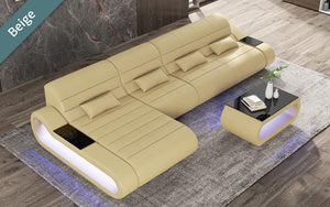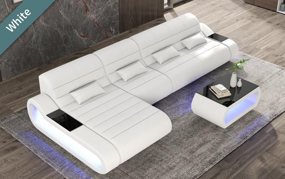 The Catina Small Leather Sectional is available in 10 different colors of genuine or bonded leather. Configure to fit your own style and specifications - L-shaped, left or right hand facing. This couch features storage space at both ends of the sectional, perfect for books or decorative items. These storage spaces are illuminated by a LED light. It can be optionally upgraded to multi-color lights that can be controlled by a wireless remote. This modern leather couch is sleek yet contemporary. This simple design will accent other pieces in the room and tie it together beautifully. To complete the look of your living space we recommend adding the armless chair and coffee table. Cup holders and USB ports are recommended for larger families to optimize maximum enjoyment. An additional bed function makes a great movie night with the family or space for unexpected guests. With the generous size of this sectional, family and friends will gladly socialize in comfort.