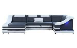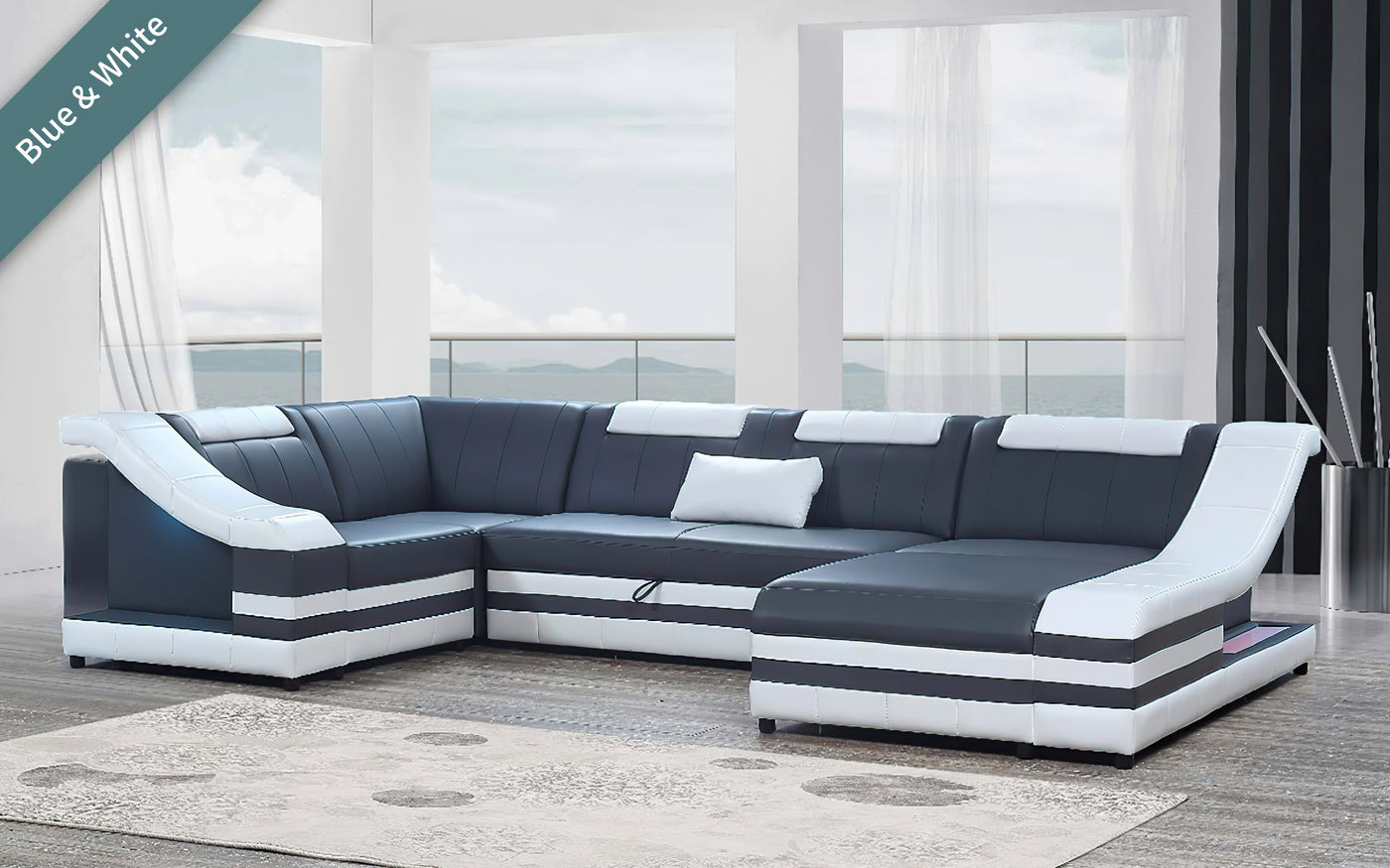 The Comet Leather Sectional with LED Light is available in two-toned or contrasting colors in Italian leather and bonded leather. Choose your preferred color leather from a selection of 10 distinct colors. The sleek, inviting design of this couch quickly catches the eye of visitors. Crafted custom to fulfill your desired aesthetic. The spacious chaise is perfect to lay down and rest after a busy day. Choose your configuration left hand facing or right-hand facing chaise to customize to your desired design. It features two storage spaces perfect for books or decorative items. The side of this leather couch are illuminated by a LED light. It can be optionally upgraded to multi-color lights that can be controlled by a wireless remote. This sleek, modern sectional is a must have for every contemporary home. To complete the look of your living space we recommend adding the armless chair and coffee table. Cup holders and USB ports are recommended for larger families to optimize maximum enjoyment. An additional bed function makes a great movie night with the family or space for unexpected guests. With the generous size of this sectional, family and friends will gladly socialize in comfort.