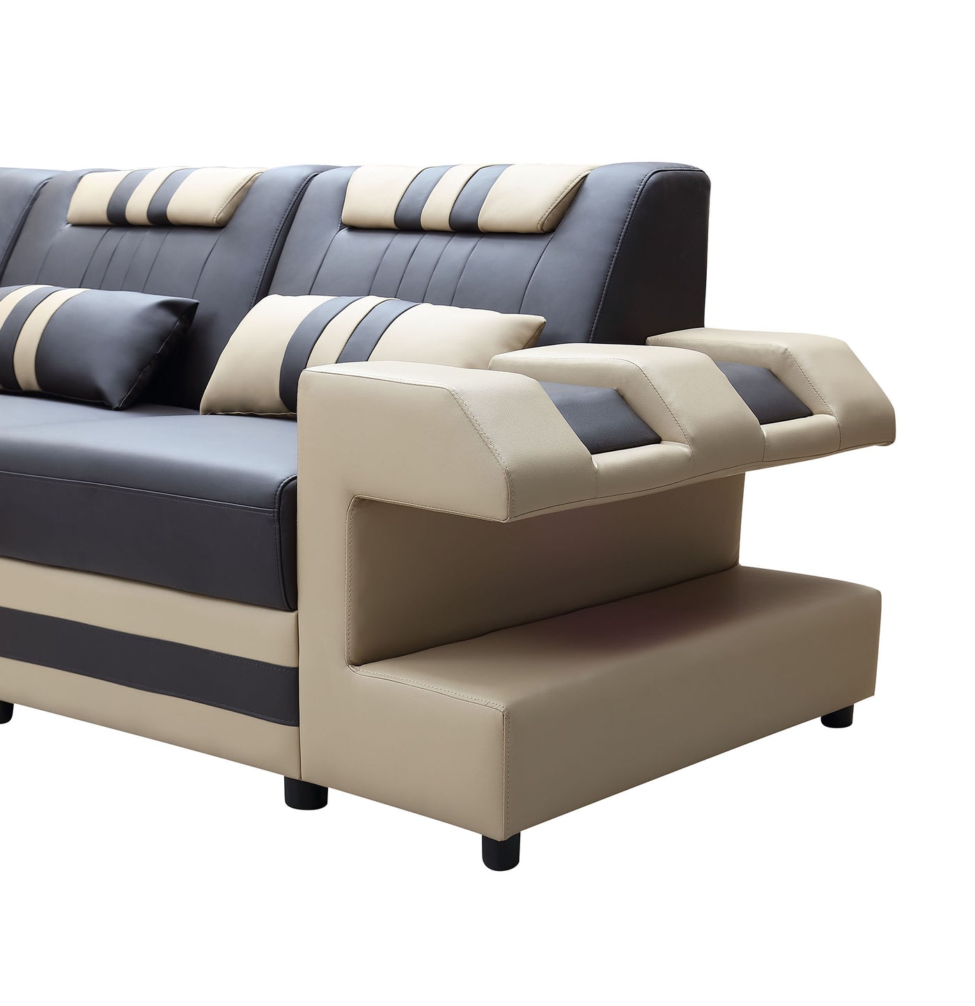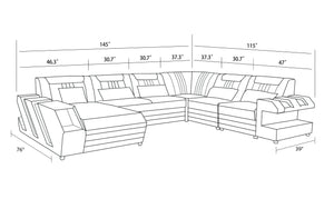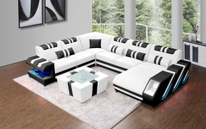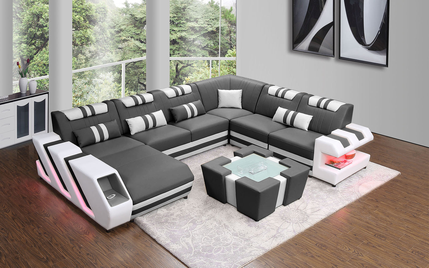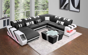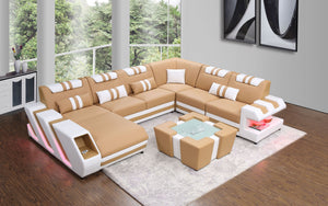 The Neptune Modern Leather Sectional with LED lighting is available in two-toned or contrasting colors in Italian leather and bonded leather. It features two storage spaces perfect for books or magazines.  The side of this leather couch are illuminated by a LED light. It can be optionally upgraded to multi-color lights that can be controlled by a wireless remote. Each top headrest is adjustable. Choose your configuration left hand facing or right-hand facing chaise to customize to your desired design. This modern couch is a stylish and lively addition to your living space. The unique angular design on the sides of this sectional quickly catch the eye of visitors. To complete the look of your living space we recommend adding the ottoman and coffee table. Cup holders and USB ports are recommended for larger families to optimize maximum enjoyment. An additional bed function makes a great movie night with the family or space for unexpected guests. With the generous size of this sectional, family and friends will gladly socialize in comfort.