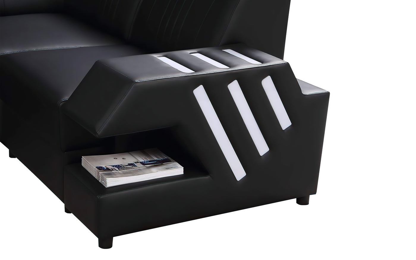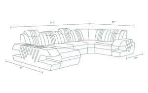 The Pluto Leather Sectional with Adjustable Headrest is available in two-toned or contrasting colors in Italian leather and bonded leather. It features two storage spaces perfect for books or magazines. The side of this leather sectional are illuminated by a LED light. It can be optionally upgraded to multi-color lights that can be controlled by a wireless remote. Each top headrest is adjustable. Choose your configuration left hand facing or right-hand facing chaise to customize to your desired design. This modern couch is a stylish and lively addition to your living space. The unique angular design on the sides of this sectional quickly catch the eye of visitors. To complete the look of your living space we recommend adding the armless chair and coffee table. Cup holders and USB ports are recommended for larger families to optimize maximum enjoyment. An additional bed function makes a great movie night with the family or space for unexpected guests. With the generous size of this sectional, family and friends will gladly socialize in comfort.