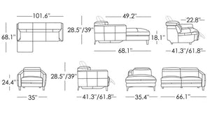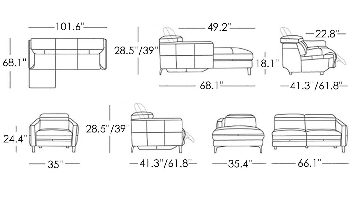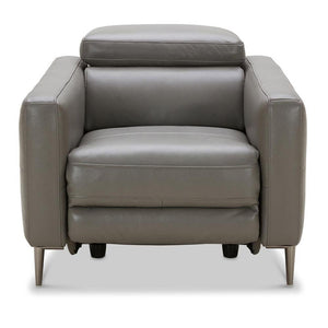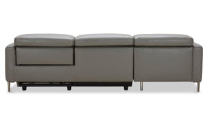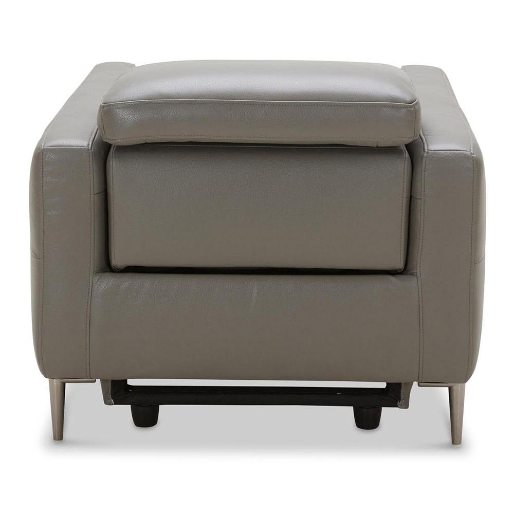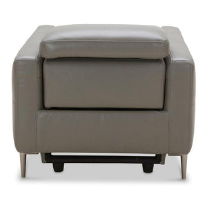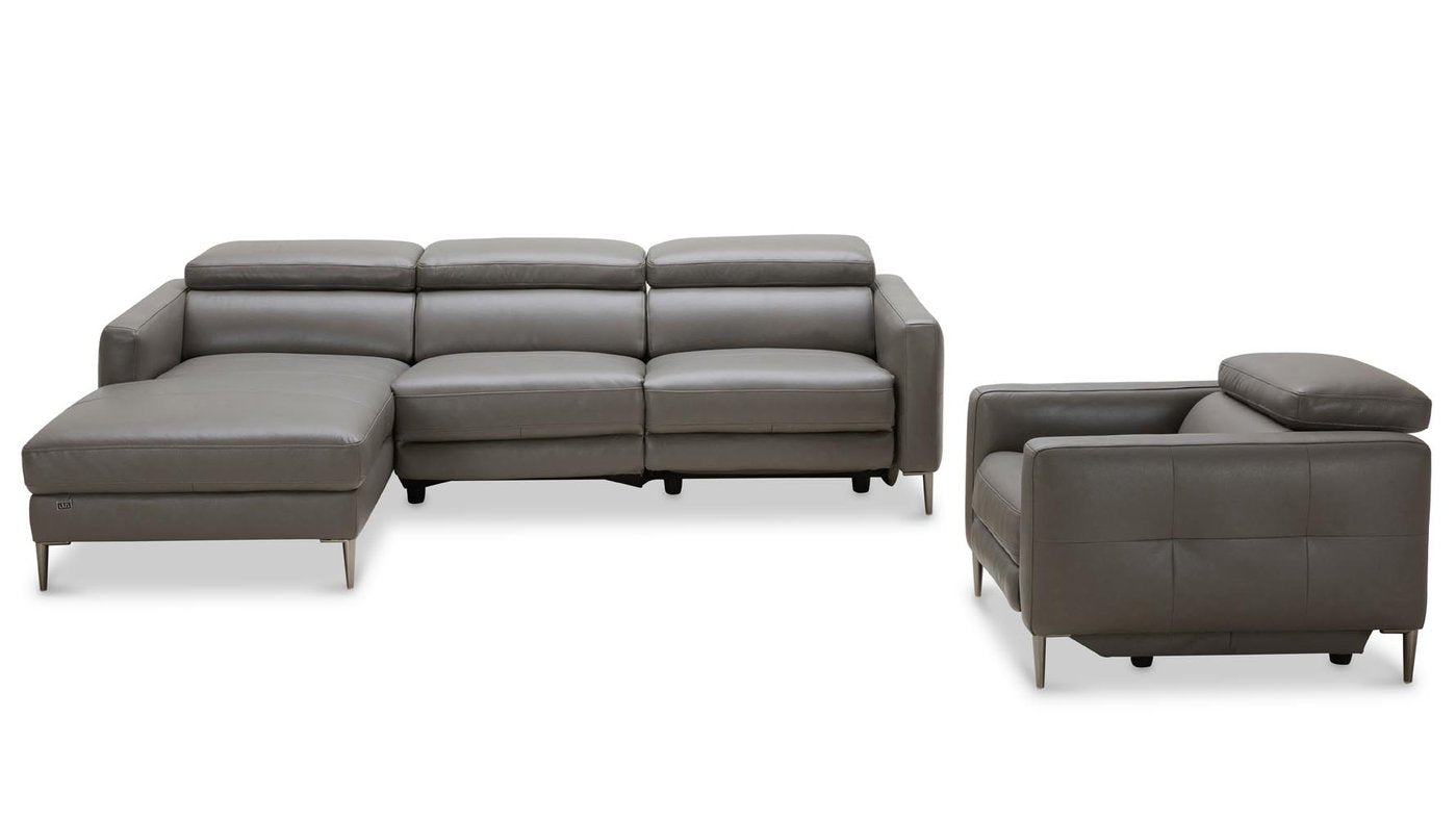 Our Kaplan Modern Reclining Sectional is available in top grain gray leather with side tufting in matching genuine split leather and modern brushed stainless steel legs. Customize in both either a left or a right facing chaise with one reclining seat on the opposite side. This sectional is perfect for any contemporary home and will accent your decorative pieces beautifully. Power reclining mechanism is hidden from view on the inside of the arm rest. Matching chair sold separately.