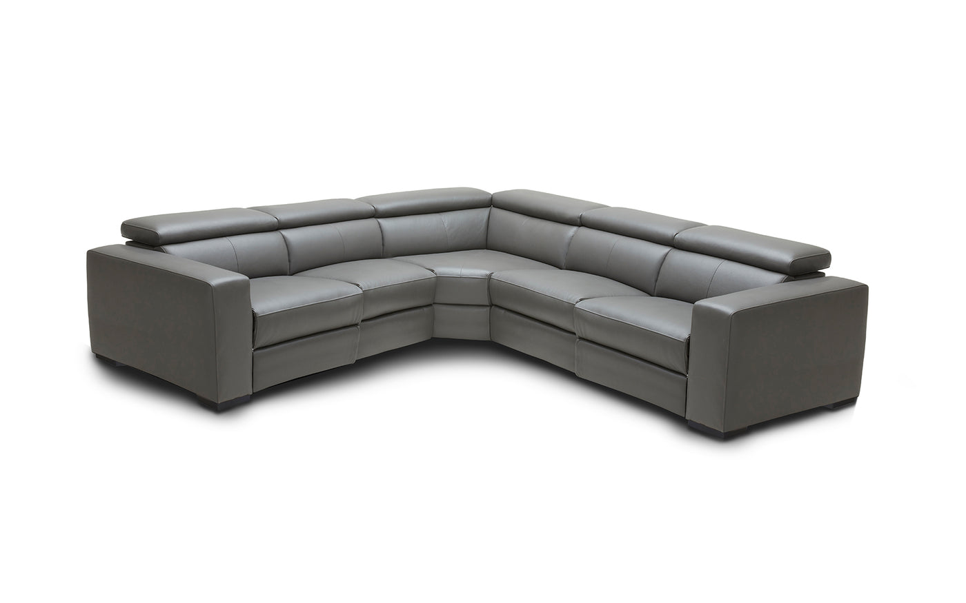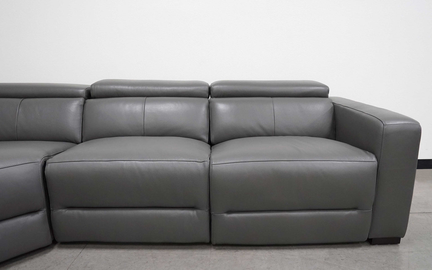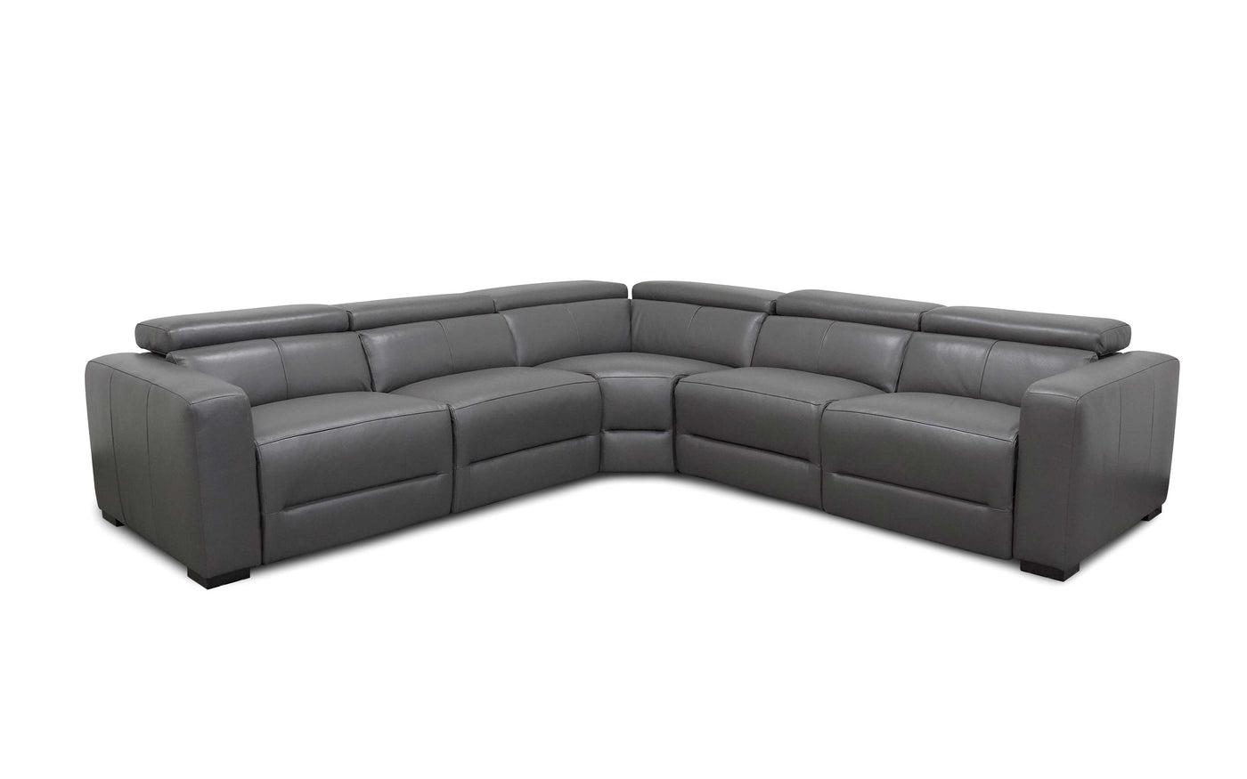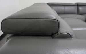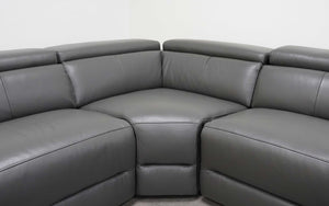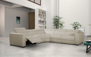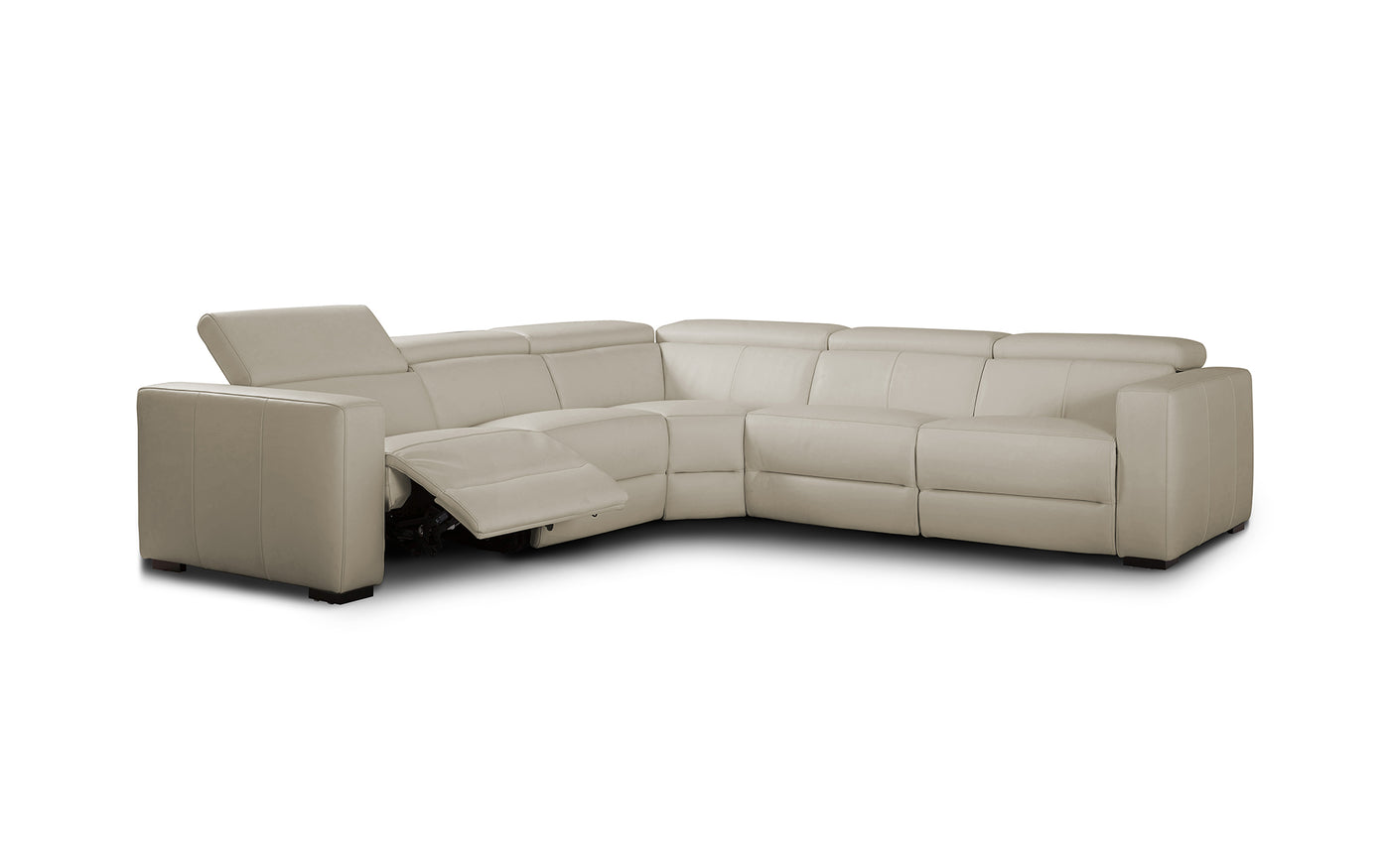 Mirage Reclining Sectional Sofa With Adjustable Headrest is made of top-grain Italian leather with a modern style. It includes three reclining chairs and a corner. The feet are made of solid wood so the sectional is durable and stable. It has five removable headrests, and the backrest is very user-friendly. This sofa is ideal for large gatherings and movie nights. Perfect for a contemporary home and lovers of comfortable lounging.