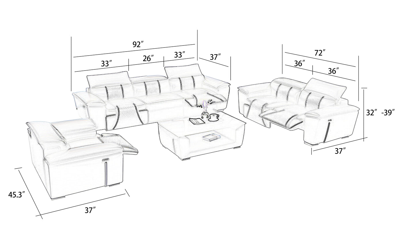 *: Sofa includes 2 manual recliner, loveseat and armchair both include 1 manual recliner