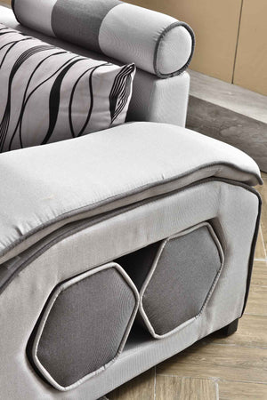The plush backrest cushions are attached to adjustable cylindrical bolster pillows that help keep them in place and prevent them from sliding down. The 5" foam seat cushions are comfortably firm and can be washed along with the backrest. Detachable padded armrests add more comfort or can be taken off to create a more formal look. Storage on both ends of the sectional add style and function as the 4-piece octagonal shape stools can be included. Frame material is made of solid wood to ensure you have a long-lasting sectional. This sleek, modern sectional is a must have for every contemporary home. To complete the look of your living space we recommend adding the armless chair and coffee table. Cup holders and USB ports are recommended for larger families to optimize maximum enjoyment. An additional bed function makes a great movie night with the family or space for unexpected guests. With the generous size of this sectional, family and friends will gladly socialize in comfort.