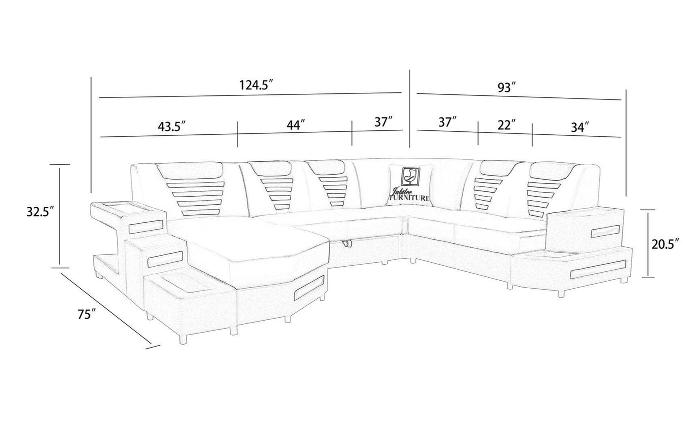 The Vega Beige & Brown Modern U-Shape Leather Sectional is available in two-toned colors in Italian leather. The sleek, sophisticated design of this couch quickly catches the eye of visitors. It features two storage spaces perfect for books or magazines. The sides of this leather couch are illuminated by multi-color lights controlled by a wireless remote. Each top headrest is adjustable and features a bed function. This sleek, modern sectional is a must have for every contemporary home. An additional bed function makes a great movie night with the family or space for unexpected guests. With the generous size of this sectional, family and friends will gladly socialize in comfort.